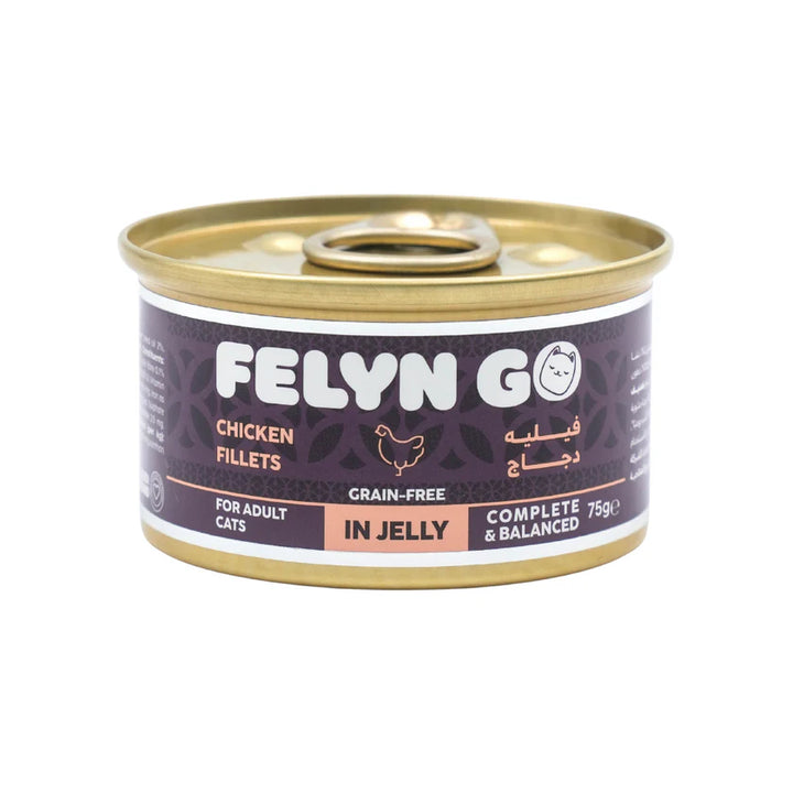 Felyn Go Wet Food for Adult Cats With Chicken Fillets in Jelly. A delicious meal made with soft chicken fillets in natural jelly, supporting hydration and digestive health. Perfect for cats of all ages, with a grain-free, additive-free formula.