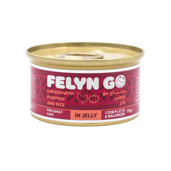 Felyn Go Wet Food for Adult Cats With Chicken and Tuna With Pumpkin in Jelly. A wholesome combination of fresh chicken, rice, and pumpkin chunks encased in natural jelly. This wet food is easy to digest, supports gut health, and offers a highly palatable texture ideal for all cats.